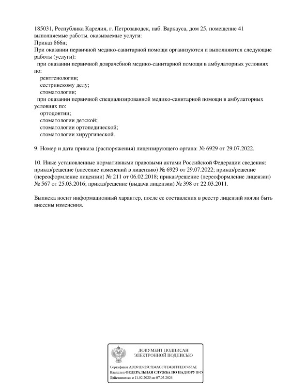 Номенклатура работ и услуг: При оказании первичной медико-санитарной помощи организуются и выполняются следующие работы (услуги): при оказании первичной доврачебной медико-санитарной помощи в амбулаторных условиях по: рентгенологии; сестринскому делу; стоматологии; при оказании первичной специализированной медико-санитарной помощи в амбулаторных условиях по: ортодонтии; стоматологии детской; стоматологии ортопедической; стоматологии хирургической.