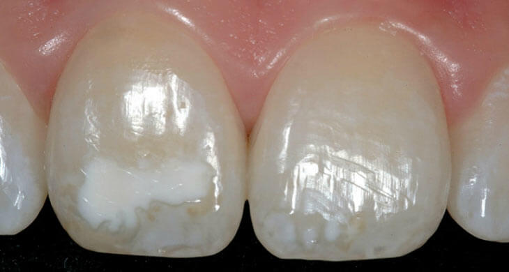 Эрозия эмали выглядит как потускневшие под действием деминерализации пятна округлой или овальной (часто просто неправильной формы) в твердых тканях зуба. Чаще всего, они симметрично расположены на щечной или фронтальной поверхности одноименных зубов (наиболее уязвимы клыки и премоляры верхней и нижней челюсти, а также резцы верхней челюсти), при этом различают три степени эрозии зубной эмали по глубине поражения твердых тканей зуба.